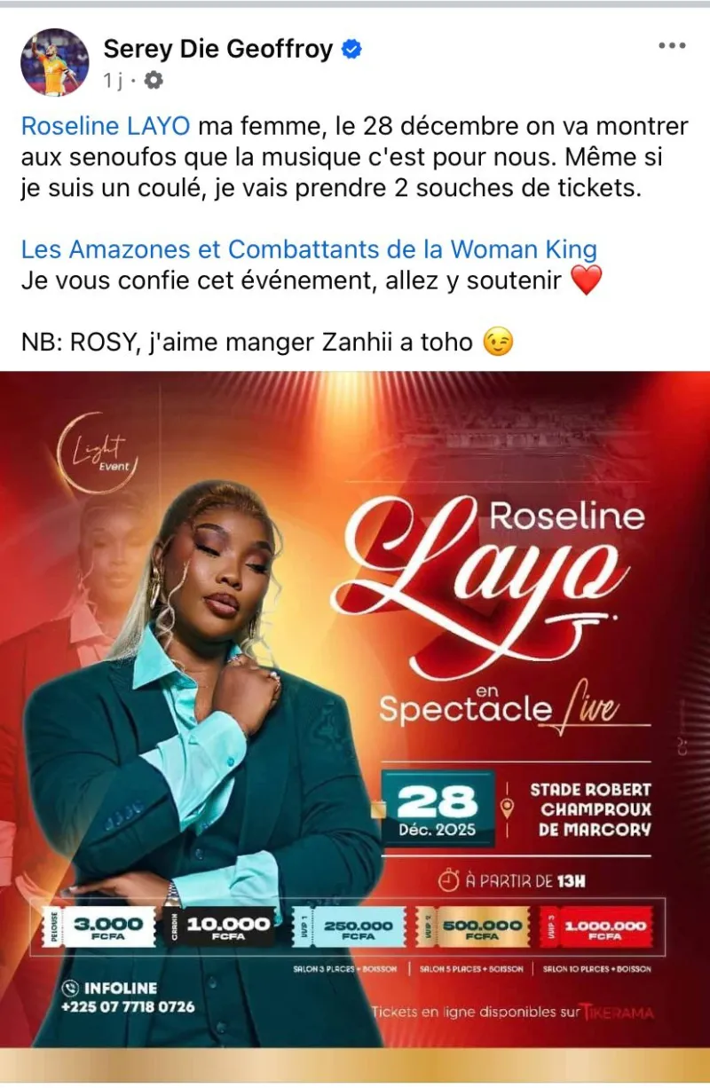 Fidèle à son tempérament jovial, Sérey Die n’a pas tardé à répondre avec le même esprit de camaraderie. L’ex-capitaine des Éléphants a promis d’acheter deux souches de tickets pour le concert de Roseline Layo, prévu le 28 décembre au stade Robert Champroux.